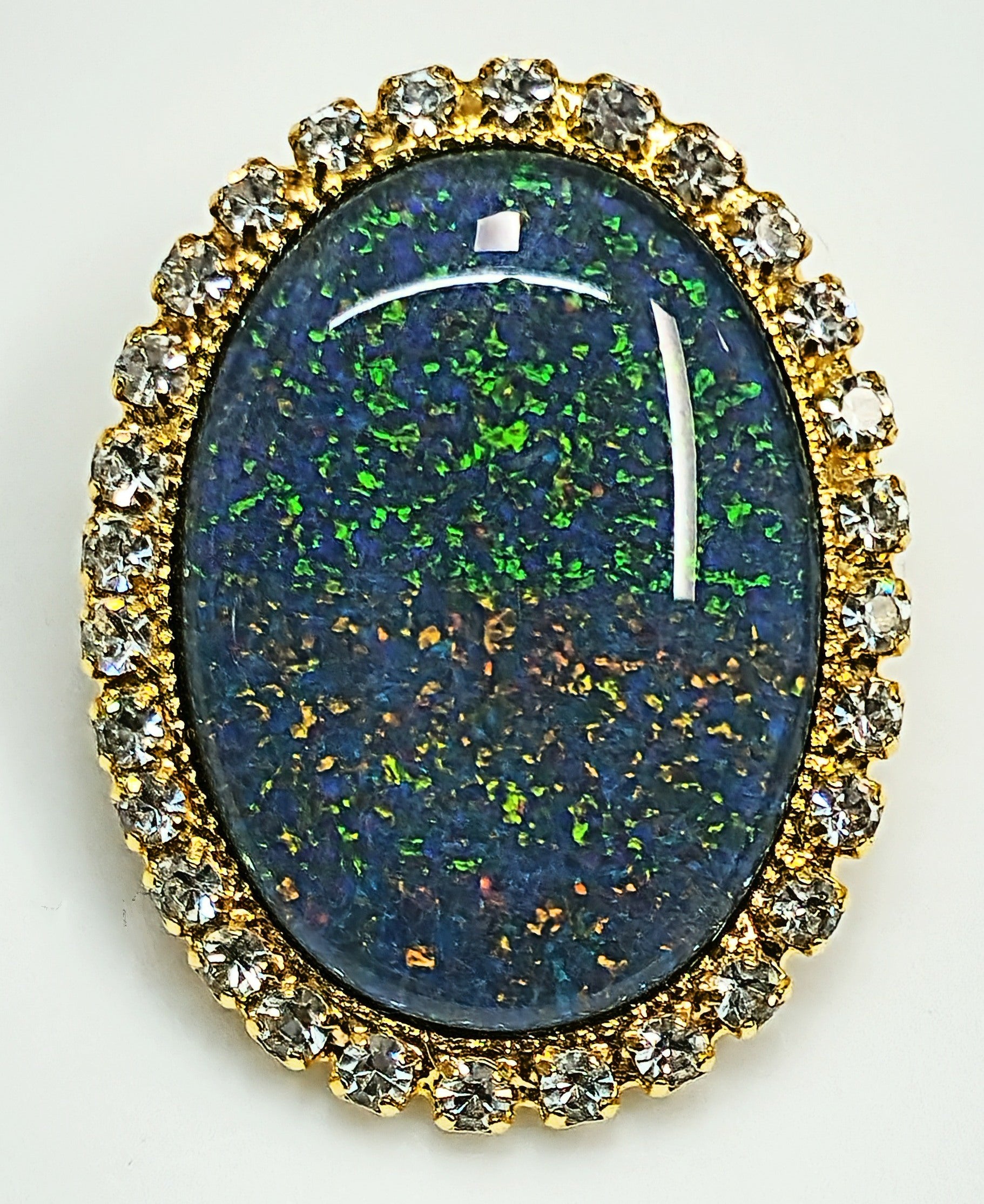 Gold plated brooch set with a very large, and very good quality, Australian Opal Triplet, which is surrounded by Swarovski rhinestones.